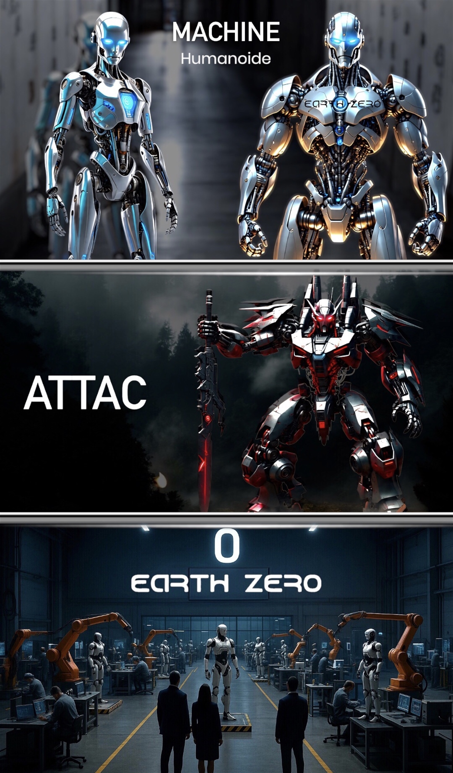 Robôs humanoides da Earth Zero (0), são robôs projetados para replicar a forma e as funções do corpo humano, com o objetivo de interagir de forma mais natural e intuitiva com o ambiente humano e realizar tarefas que requerem habilidades similares às dos humanos. Eles são caracterizados por sua aparência física que imita a estrutura humana, com cabeça, tronco, braços e pernas, e podem incluir recursos como inteligência artificial para imitar comportamento humano.